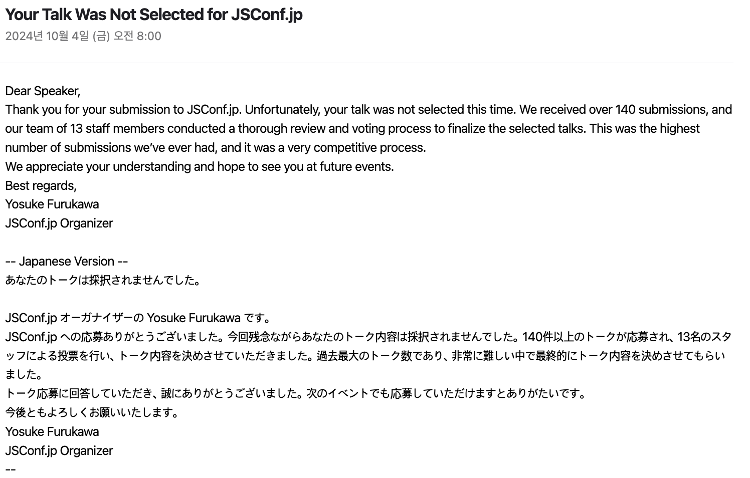 올해는 작게 몇번의 발표를 하였다. 우연히 JSconf 일본의 행사를 알게 되어서, 호기롭게 신청해보았으나 떨어졌다.