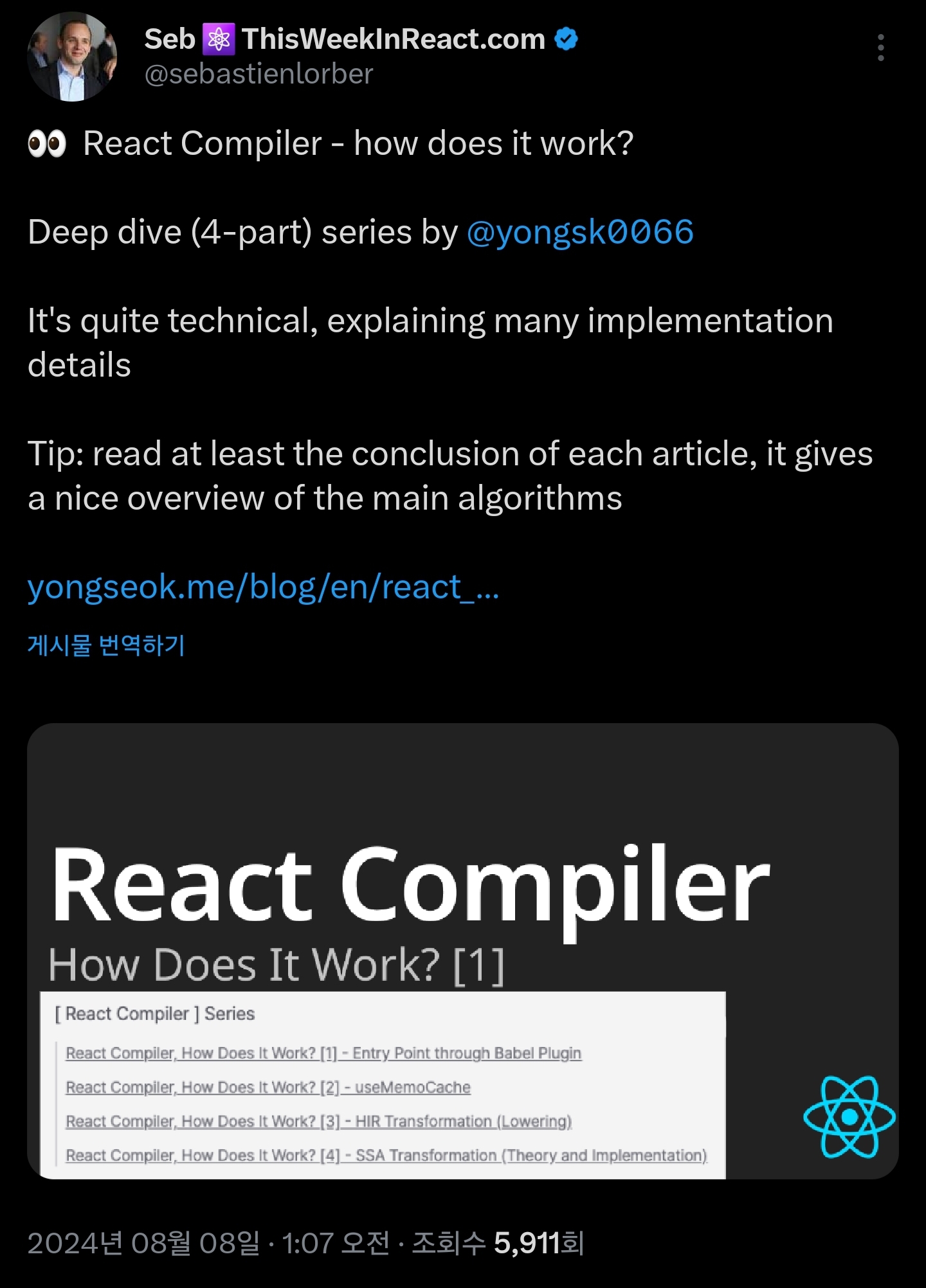 React Conf를 다녀온 뒤로 열심히 React Compiler에 대한 글을 4편 쓰고, 주변에 공유하였다.