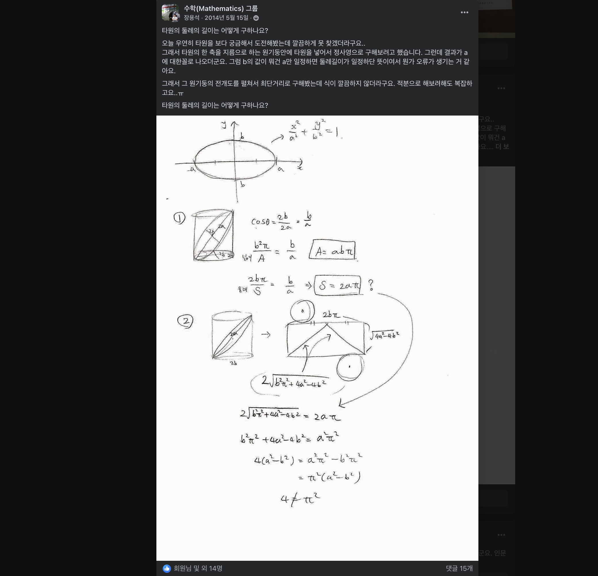 나 스스로도 증명되지 못하였지만, 당시 답변을 기억해봐도 아무튼 타원의 둘레는 어려운 것 이라고 종결지어졌었다.