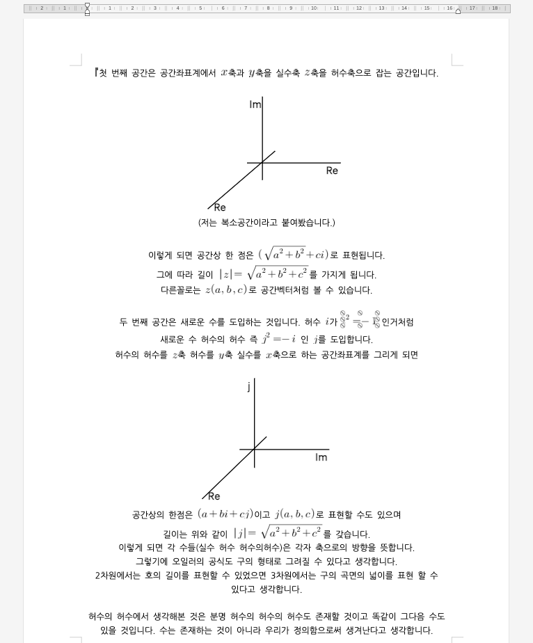 목적성은 없는, 무언가 유도되는 그런 사고실험은 아니었지만, ‘그러지 않을까?’ 하는 생각들만 질문으로 남아있었다. 복소평면이라는 생소한 좌표계에 의문이 있던 터라 이를 공간으로 확장하면 어떨까? 그럼 어떤 축을 추가하면 좋을까? 와 같은 질문들을 떠올려봤다.
