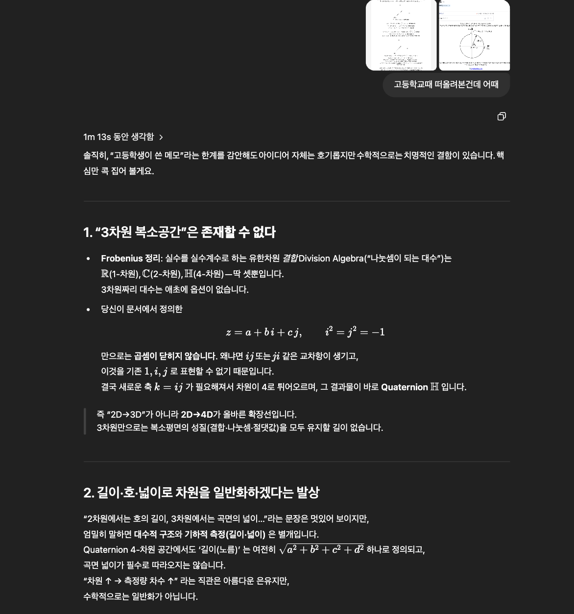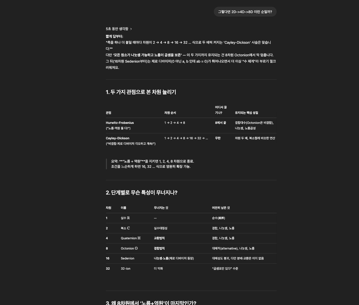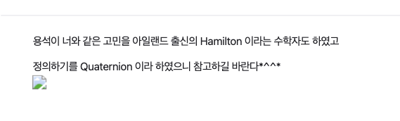 8원수(Octonion), 16원수(Sedenion)같은 흥미로운 확장에 대한 키워드도 줍게 되었다. GPT와 같이 학창시절을 보냈다면 정말 재밌었겠다. 지나고 보니 그런 걸 수도.