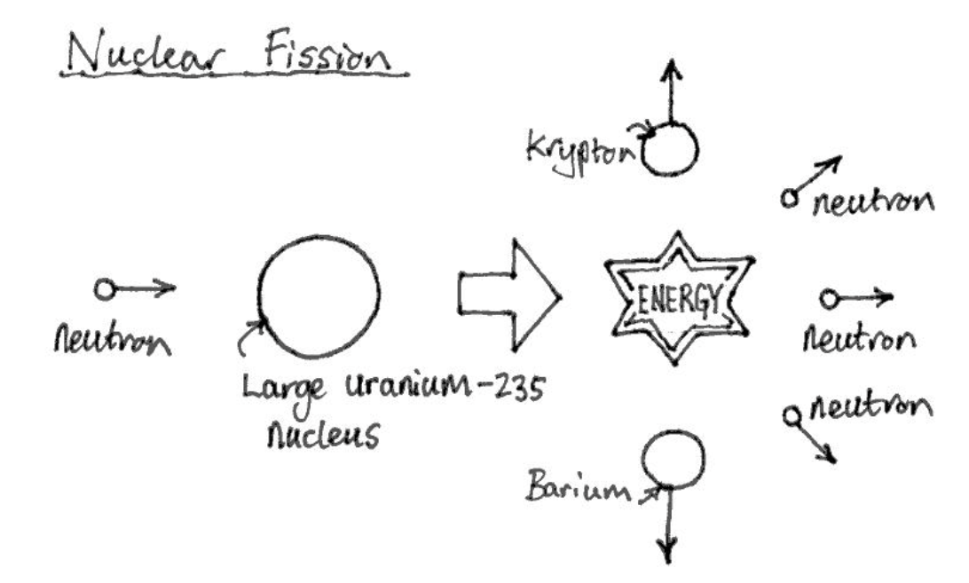 핵분열 과정에서 우라늄-235에 중성자를 충돌시켜 원자핵을 분열시킨다. 그 과정에서 질량결손으로 결합에너지가 방출되어 에너지로 변환된다.