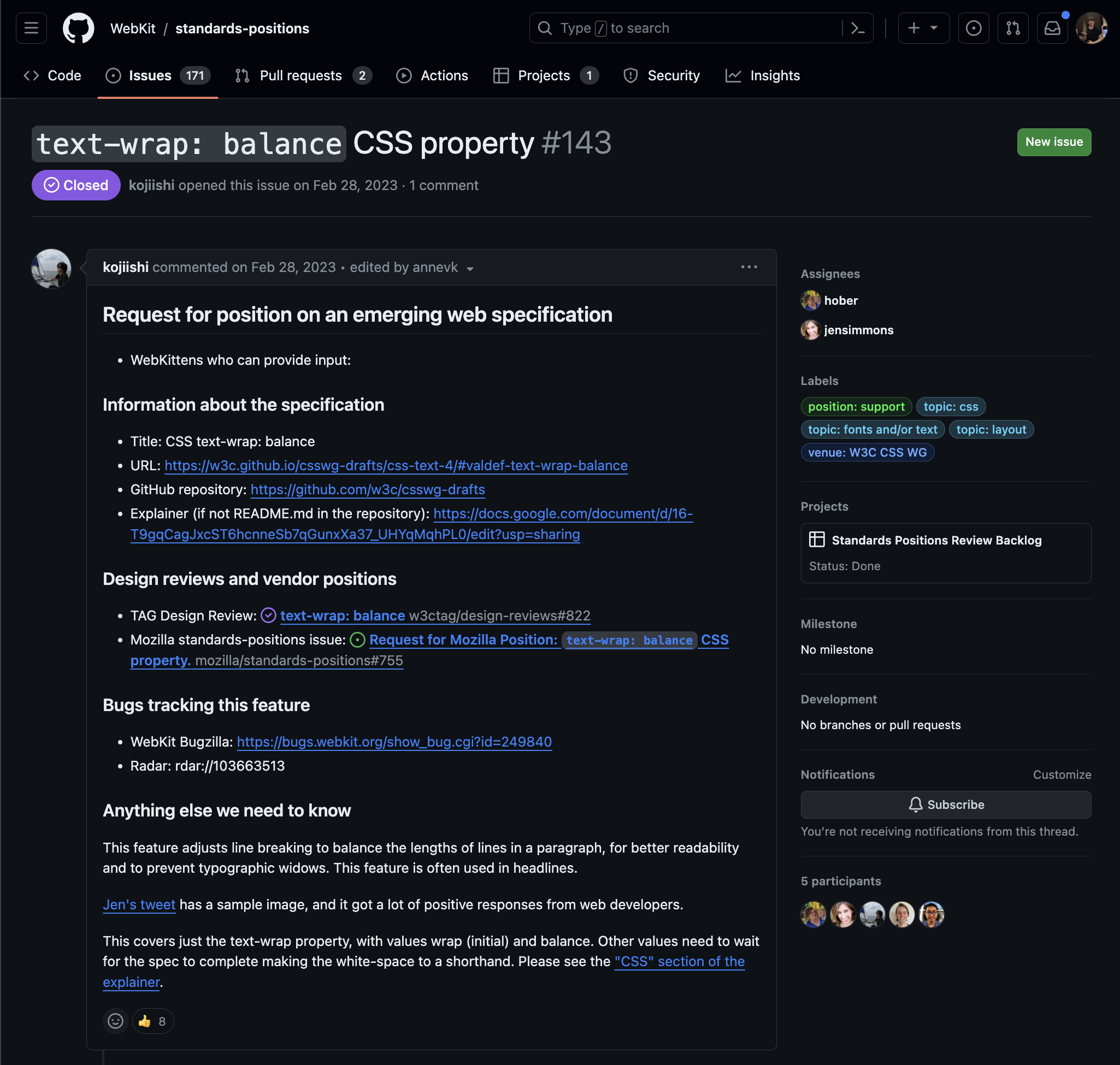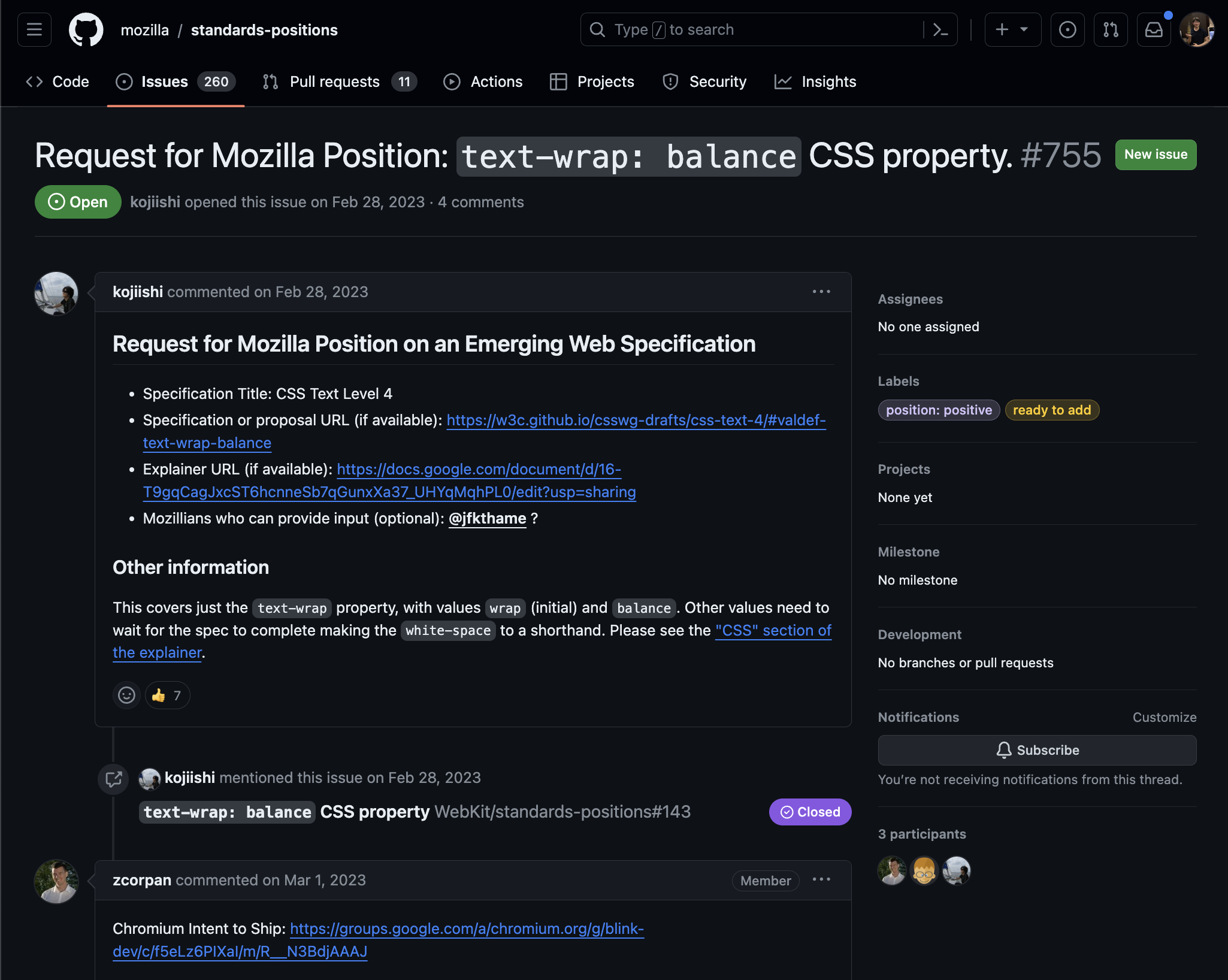 상호운용성과 호환성에 대한 이야기가 나온다. 아무래도 생태계를 위해서는 다른 브라우저들과의 호환성이 중요하다. koji가 각 브라우저 프로젝트들에 해당 기능에 대한 입장 요청을 보낸 이슈가 첨부되어 있다. 실제 엔진의 프로젝트는 아니고 standards-positions 이슈를 통해서 해당 기능에 대한 입장을 요청한 것이다.
