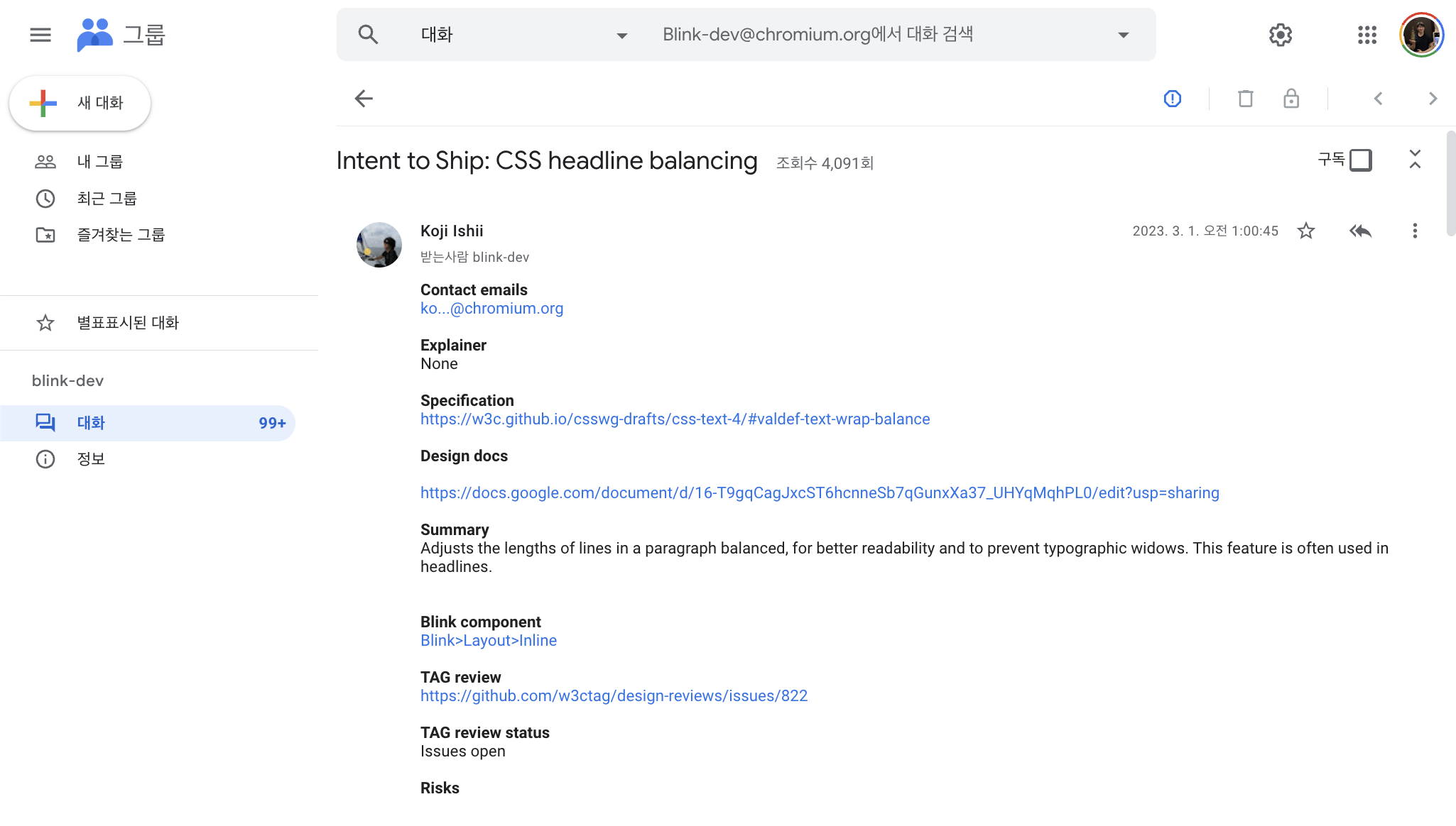 본문 자체는 이정도로 살펴보면 좋을 것 같고… 해당 이메일을 수신 받은 blink-dev 그룹이 주고 받은 내용을 살펴보자.